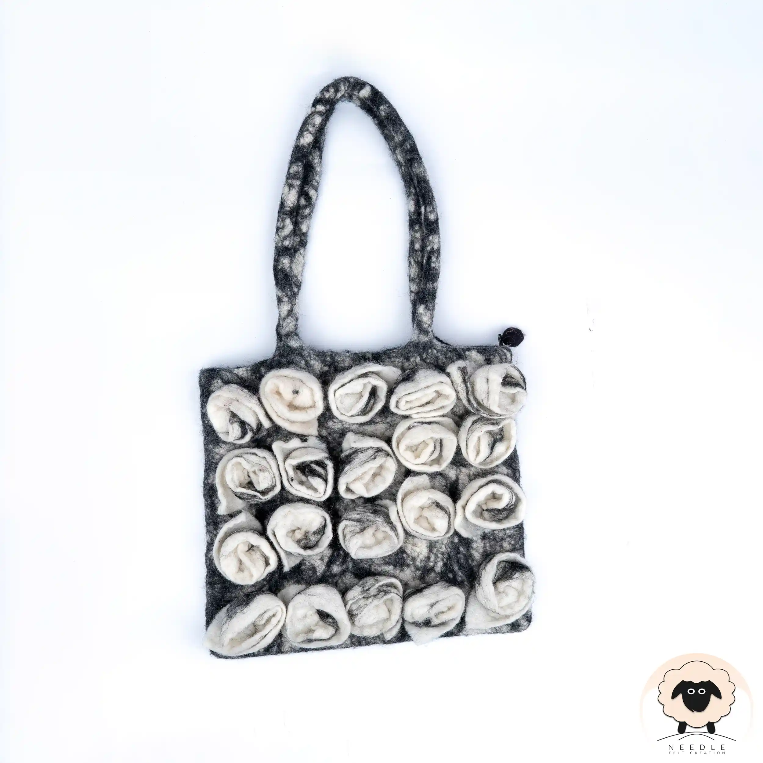 The Roses Felt Hand Bag we have is not only a functional accessory; it is a high-quality example of eco-conscious styling for those who appreciate high-texture, artisanal craftsmanship. Crafted from premium, sustainable wool felt, this bag brings a soft and organic touch to your ensemble without harming the planet. It is beautifully detailed with dozens of individually rolled 3D felt roses in a striking cream and monochrome palette, set against a sturdy dark base, creating a sophisticated and lively aesthetic that captures the lush beauty of a botanical garden. Every purchase supports ethical craftsmanship, combining environmental awareness with the timeless appeal of handmade art.